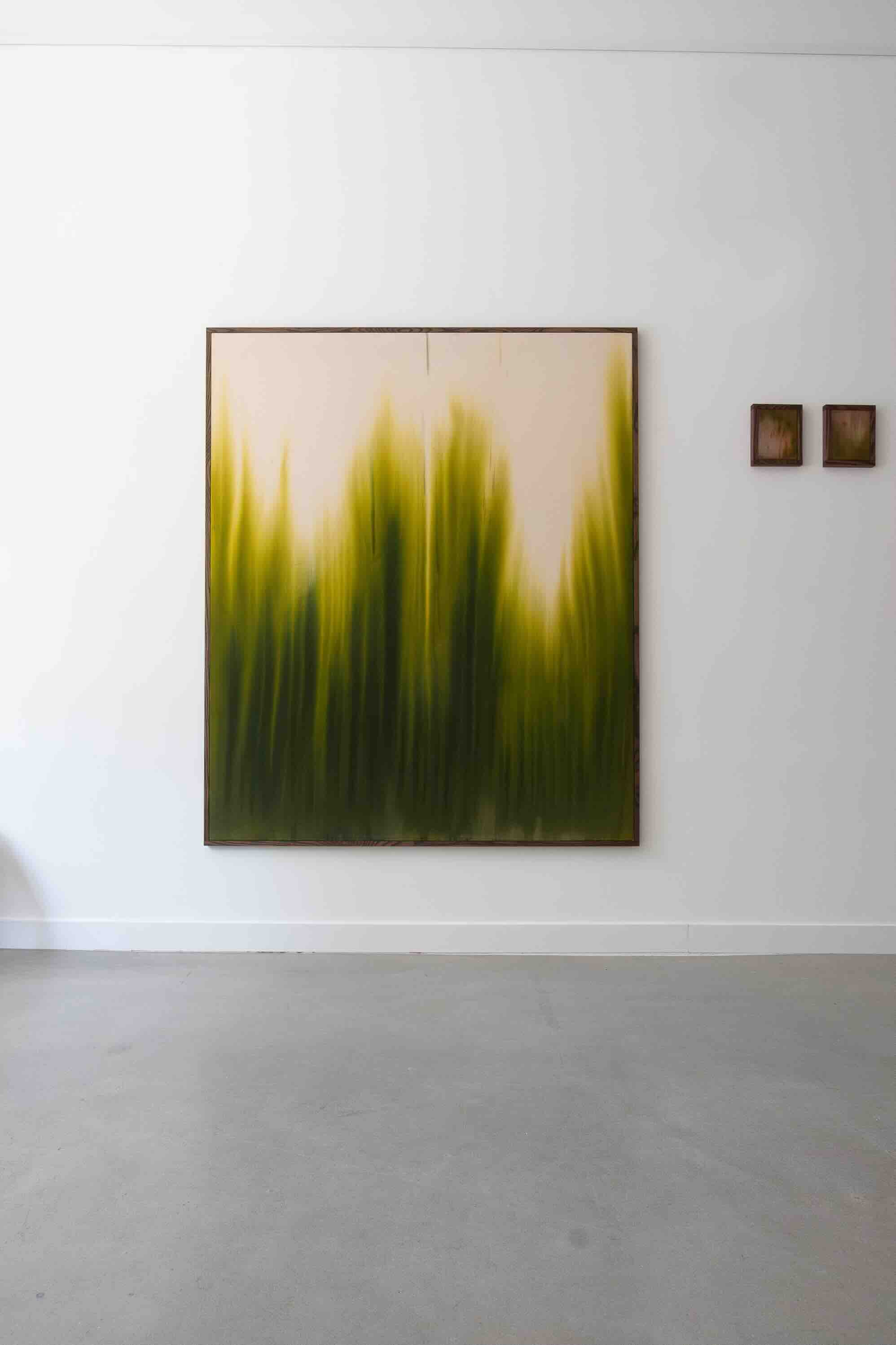 Chaque toile devient le théâtre d’une recherche chromatique précise, liée à une émotion ou une vision – de la lumière perçant une forêt, au coucher de soleil diffus. Anaïs recrée patiemment la palette de la nature grâce à sa technique singulière, le « Wet & Dry », également appelée « technique de la pétale » : elle superpose des couches d’encre sur une toile imbibée, laissée neutre par endroits, puis semi-couverte à d’autres, pour renforcer la densité et la profondeur.