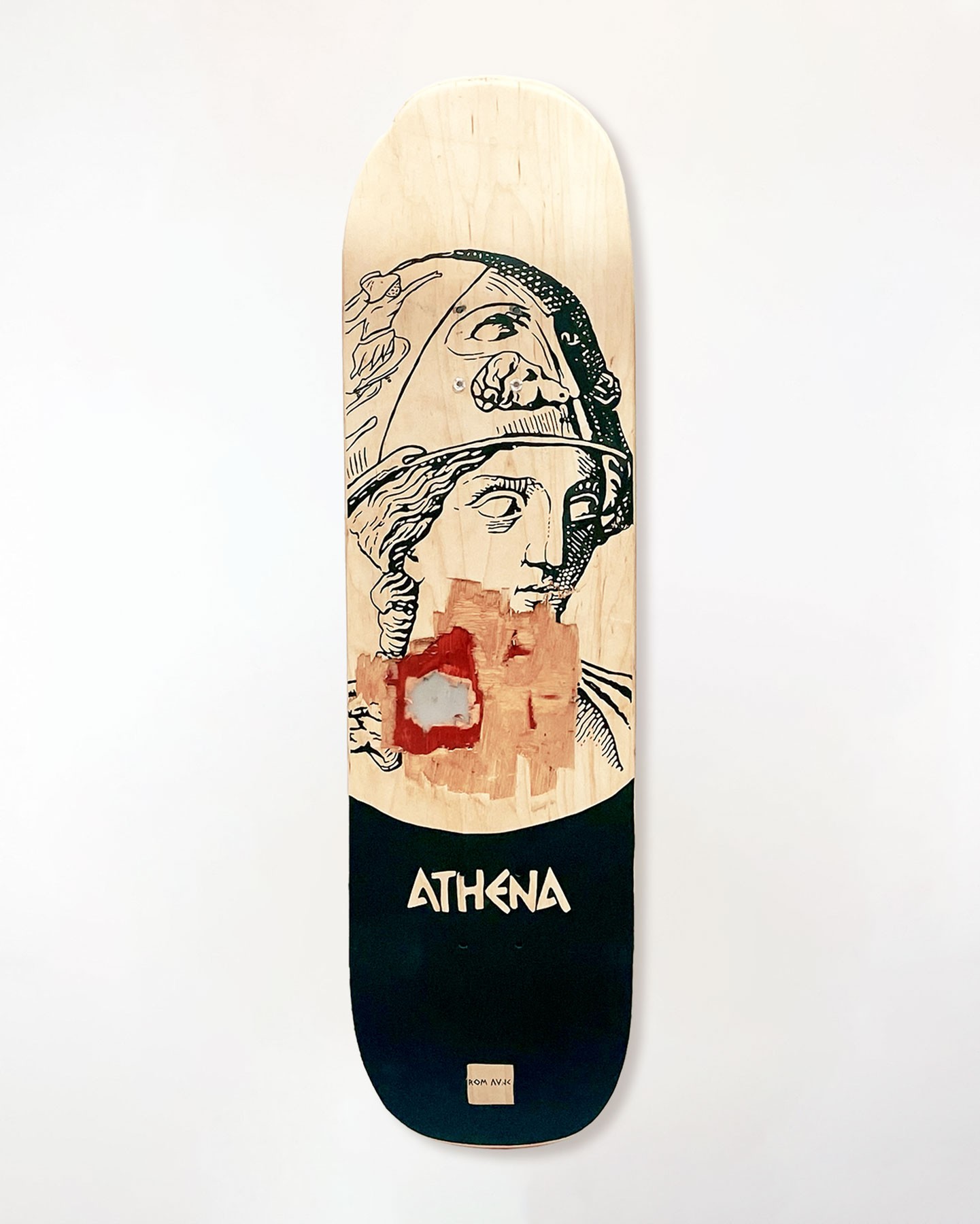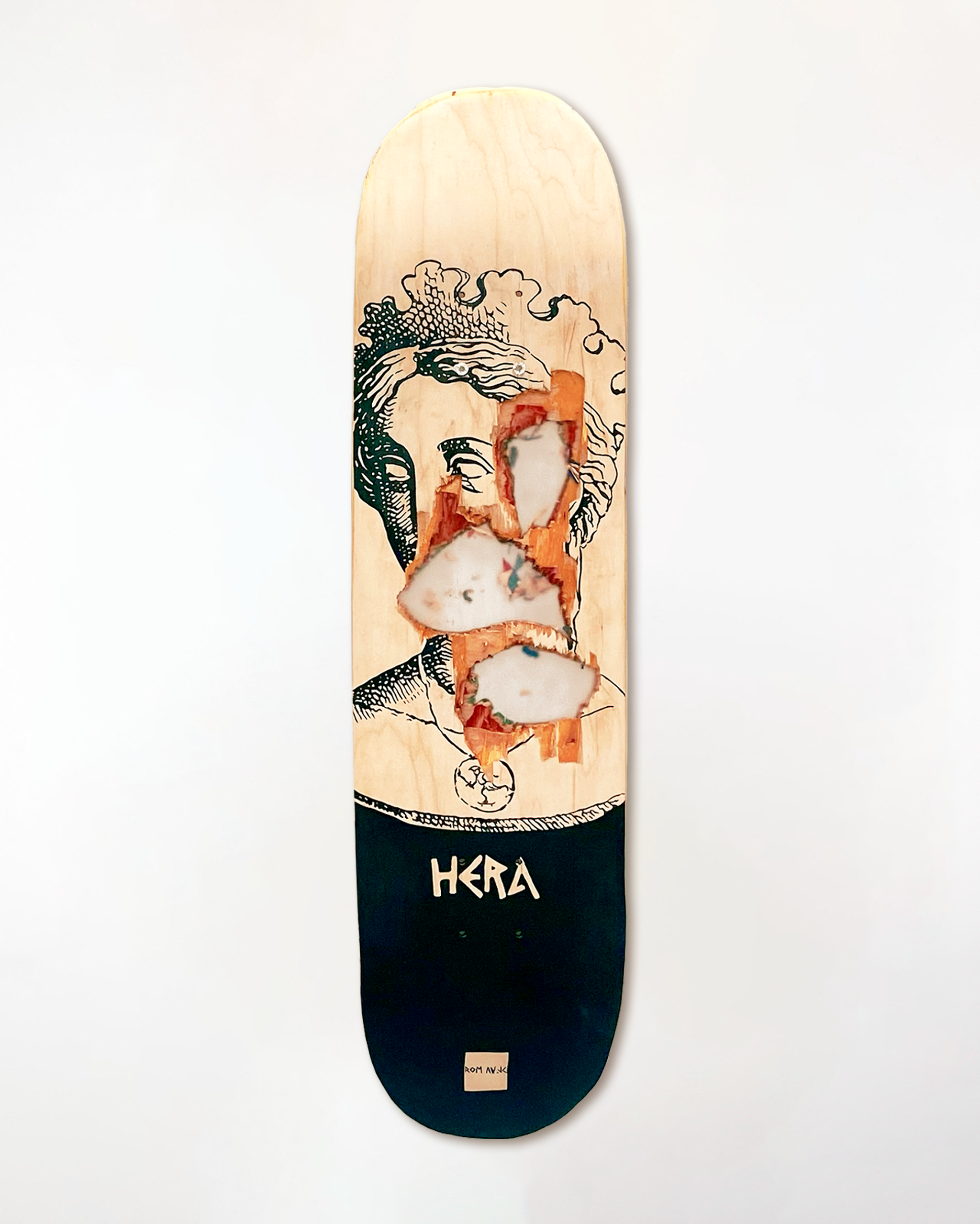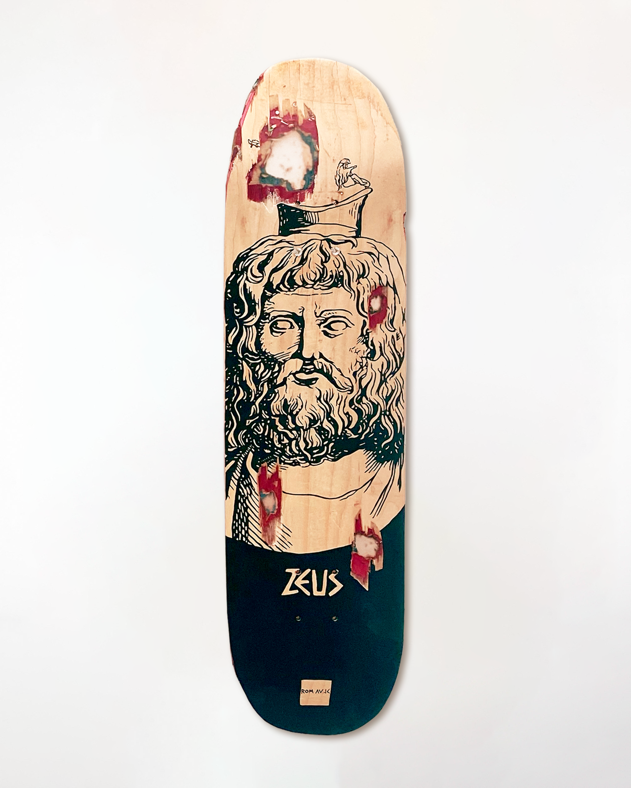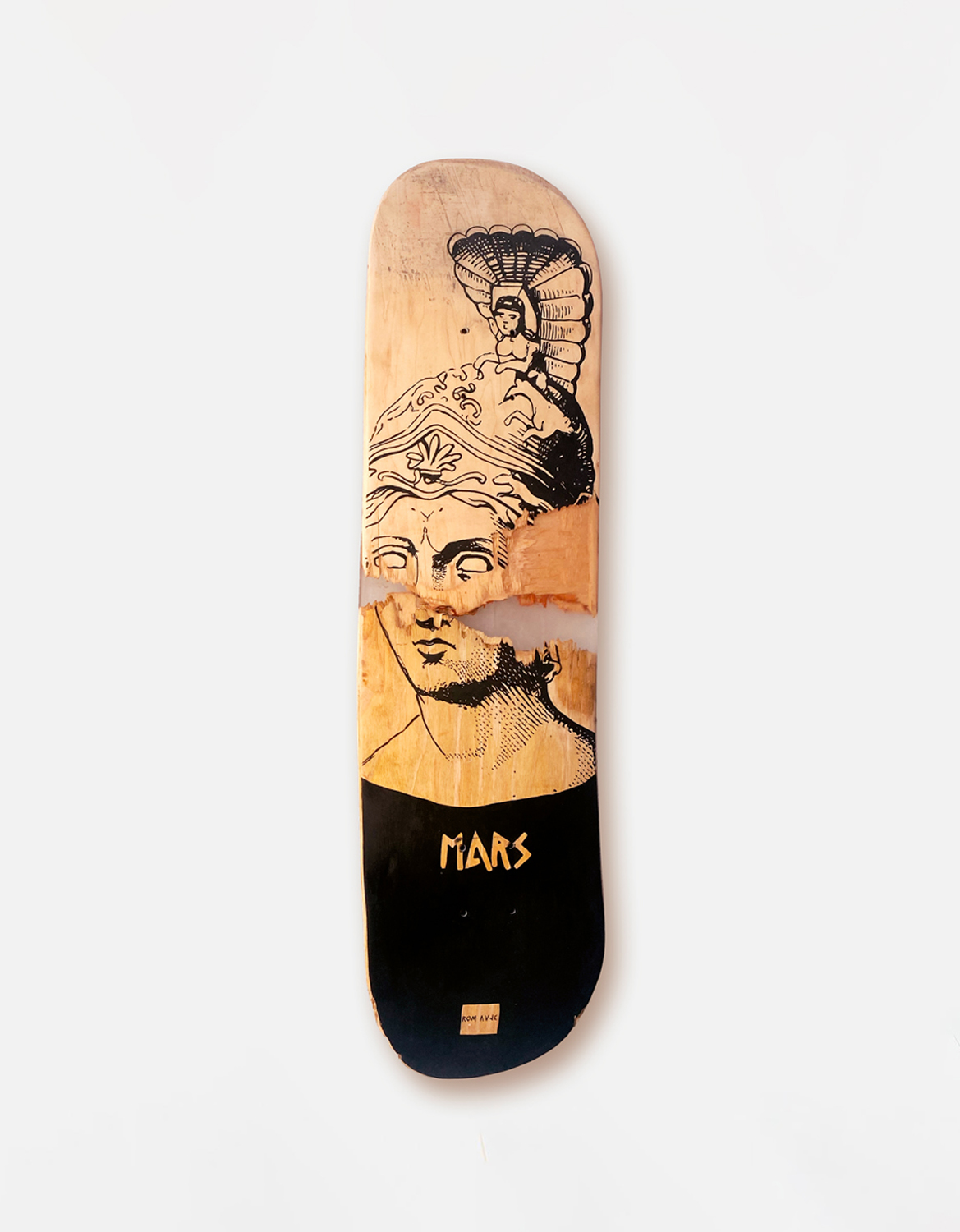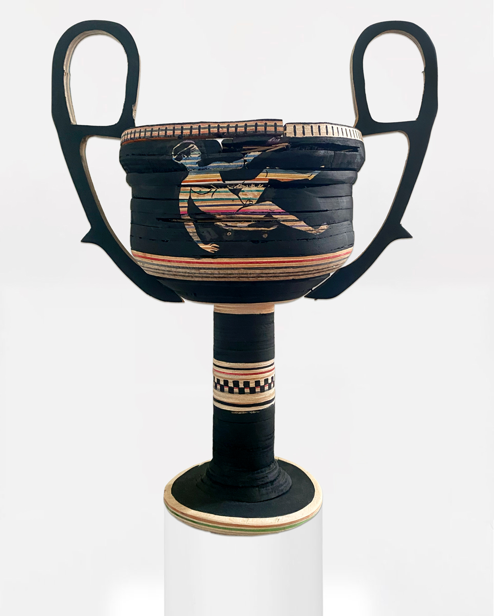Skateur avant tout depuis son plus jeune âge, sa démarche artistique repose sur la collecte de planches de skateboard cassées, que l’artiste façonne en forme de rhytons, de kylix et d’autres vases à l’inspiration gréco-romaine.