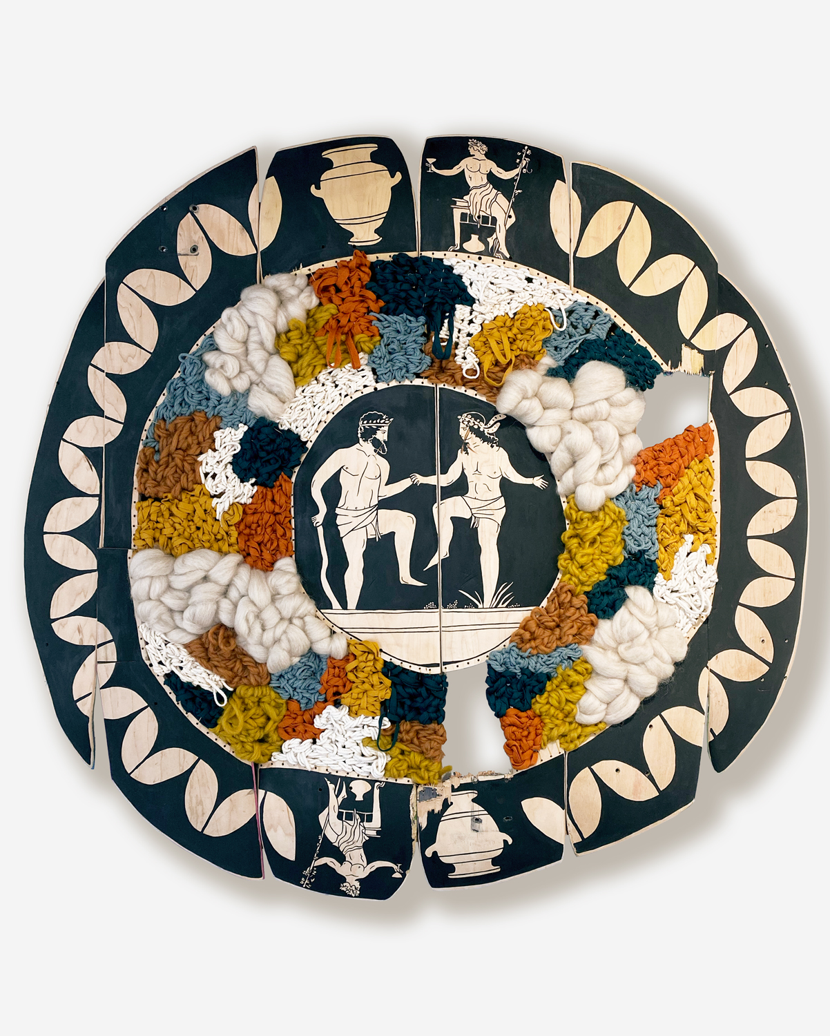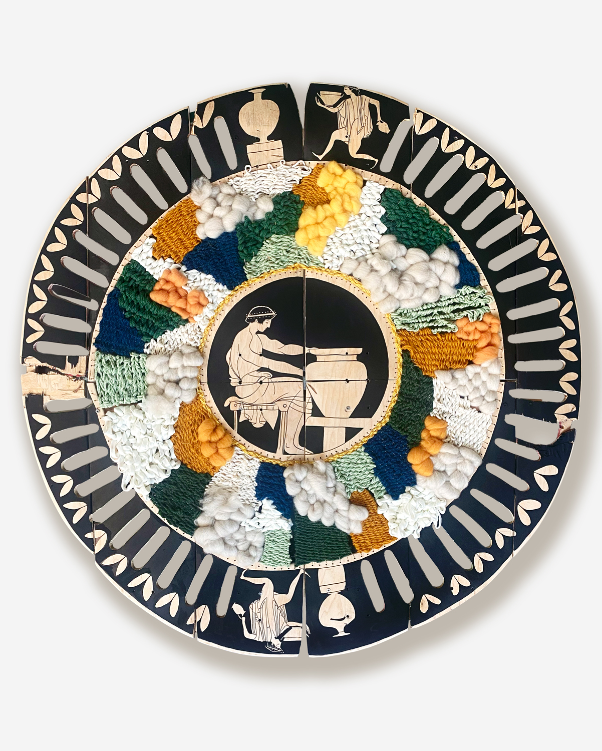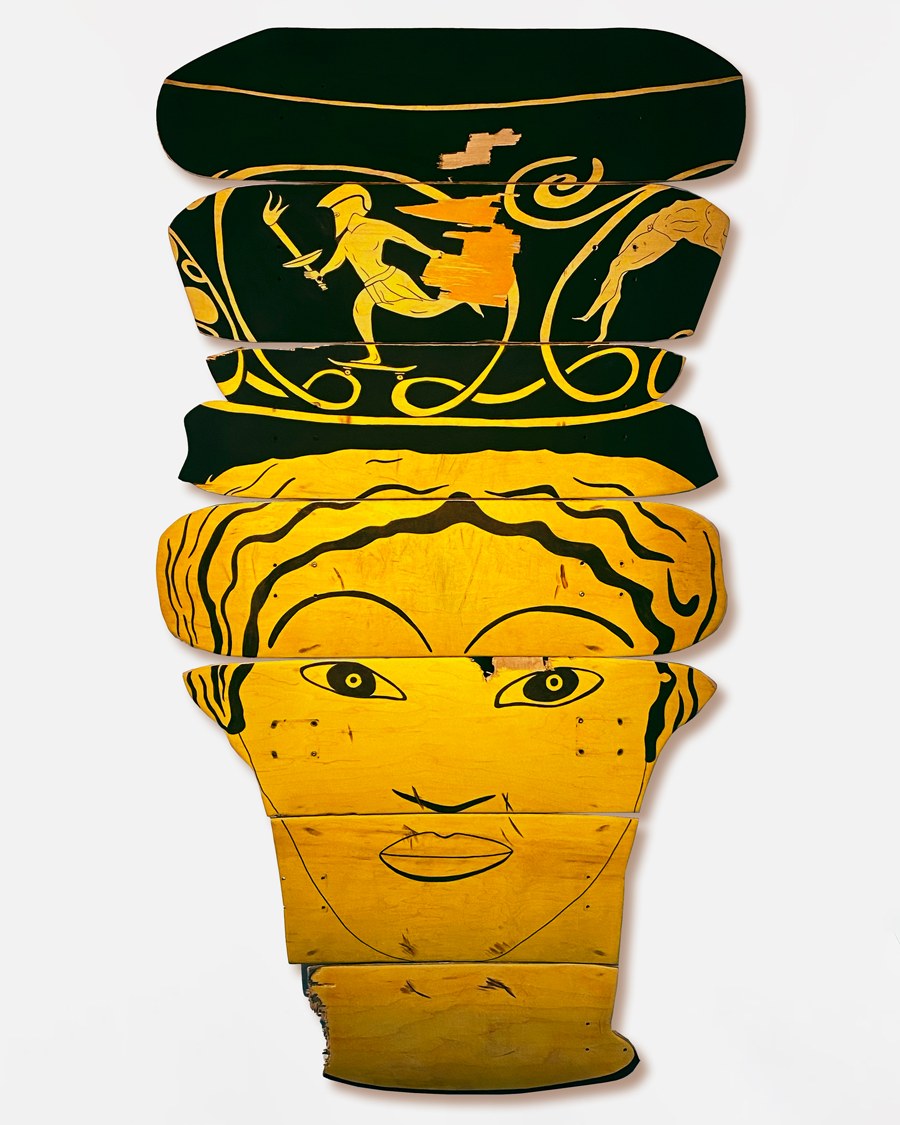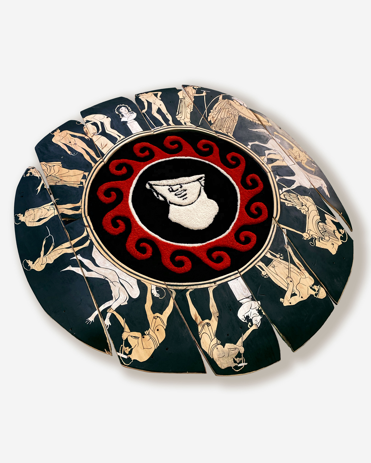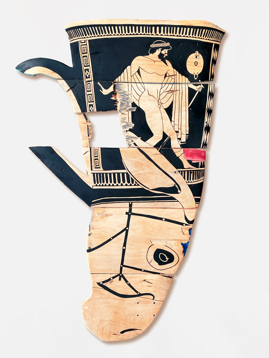 Skateur avant tout depuis son plus jeune âge, sa démarche artistique repose sur la collecte de planches de skateboard cassées, que l’artiste façonne en forme de rhytons, de kylix et d’autres vases à l’inspiration gréco-romaine.